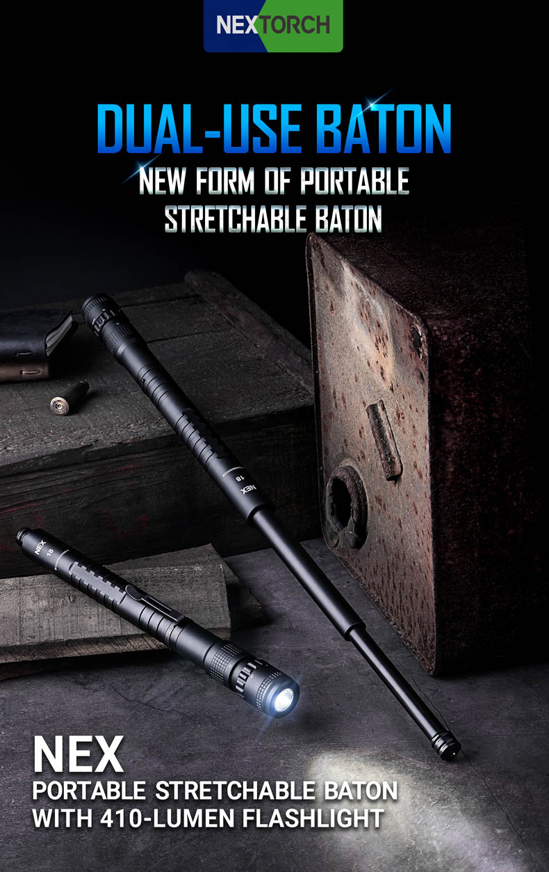 NEX Baton N18L กระบองยืดความยาว 18 นิ้ว พร้อมไฟฉายความสว่างสูงถึง 410 ลูเมน มีให้เลือกใช้ 3 โหมด สูง, ต่ำ และกระพริบ สวิทซ์นำมาจากไฟฉาย TACTICAL รุ่น TA30 สะดวกในการใช้งานอย่างยิ่ง มาพร้อมแบตเตอรี่ Li-ion 14500 แบบชาร์จไฟโดยตรงที่แบตเตอรี่ผ่านตัวเชื่อมต่อ Micro USB ใช้งานได้นานสูงสุดถึง 9 ชั่วโมง ส่วนของไฟฉายมีความสามาถในการกันน้ำลึกได้ถึง 2 เมตร ตัวกระบองมาพร้อมหัวกระแทกกระจกแบบเซรามิก