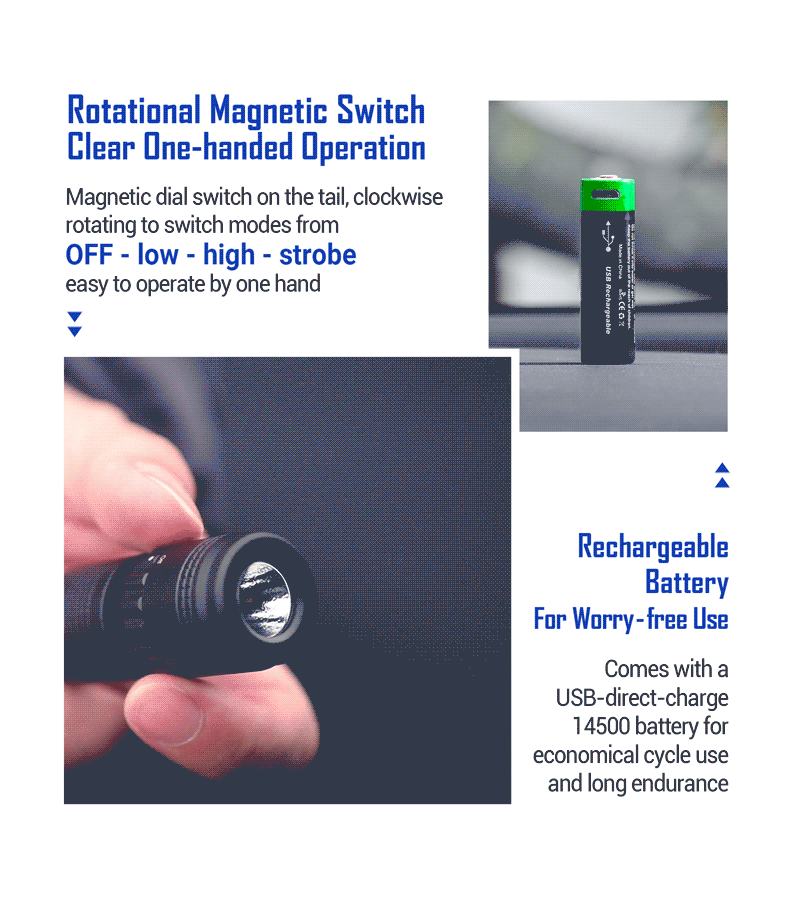 - มาพร้อมแบตเตอรี่ Li-ion 14500 แบบชาร์จไฟโดยตรงที่แบตเตอรี่ (Micro USB port)