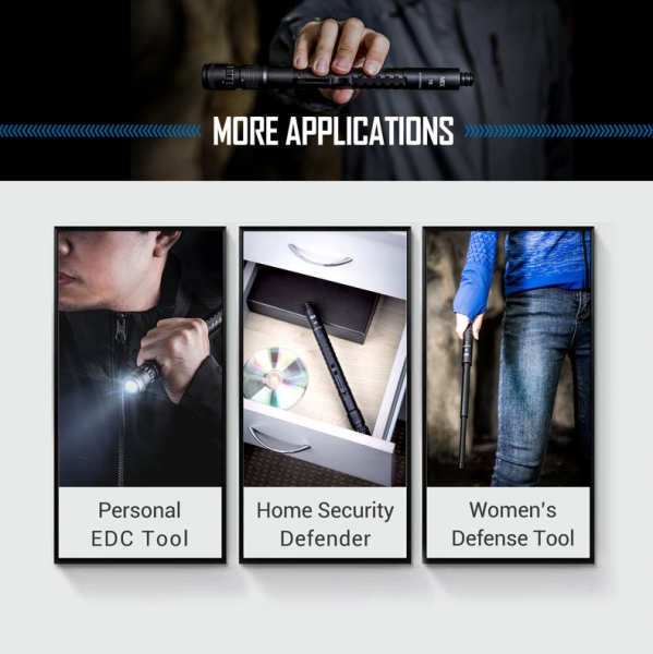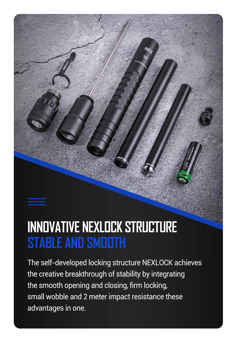 - Nex-Lock เป็นระบบล็อคที่พัฒนาโดย Nextorch มาอย่างต่อเนื่อง สามารถล็อคได้อย่างมั่นใจเมื่อยืดกระบองใช้งาน และกดปุ่มปลดล็อคเก็บกระบองได้อย่างง่ายดาย