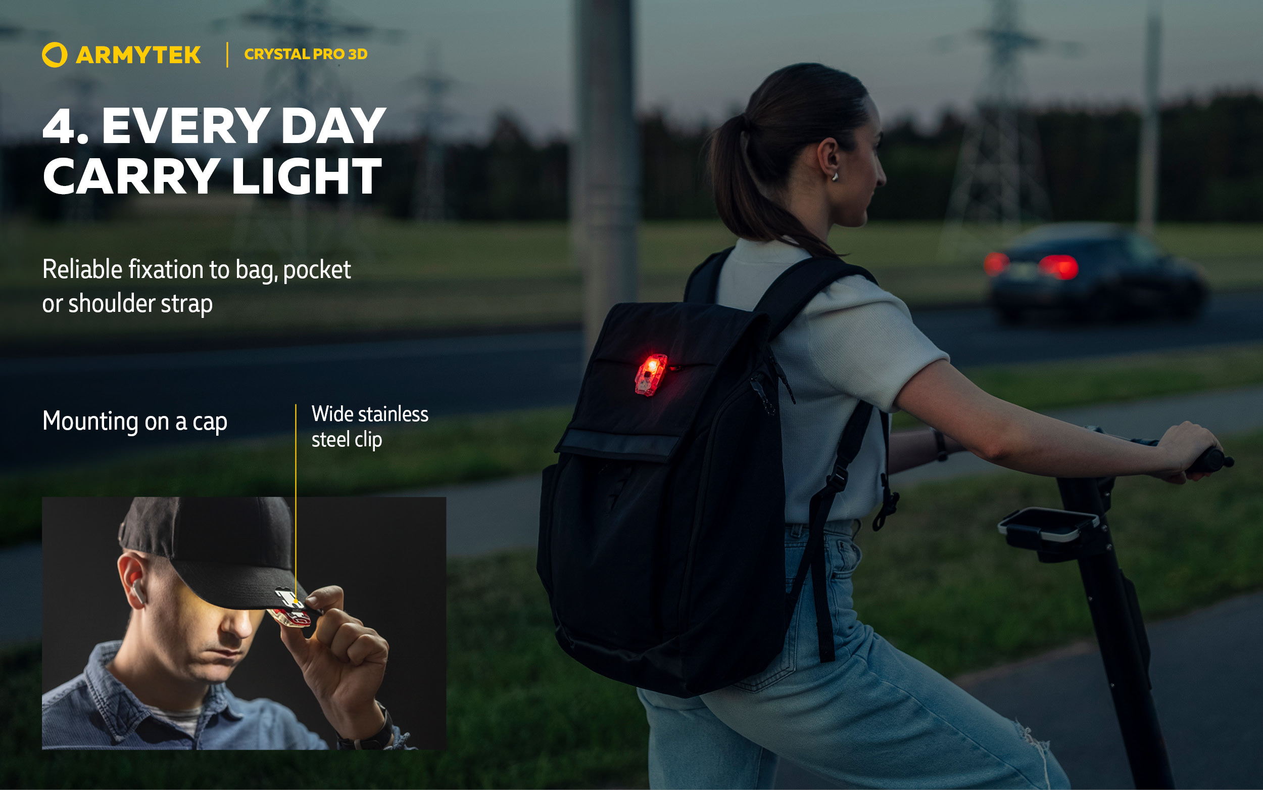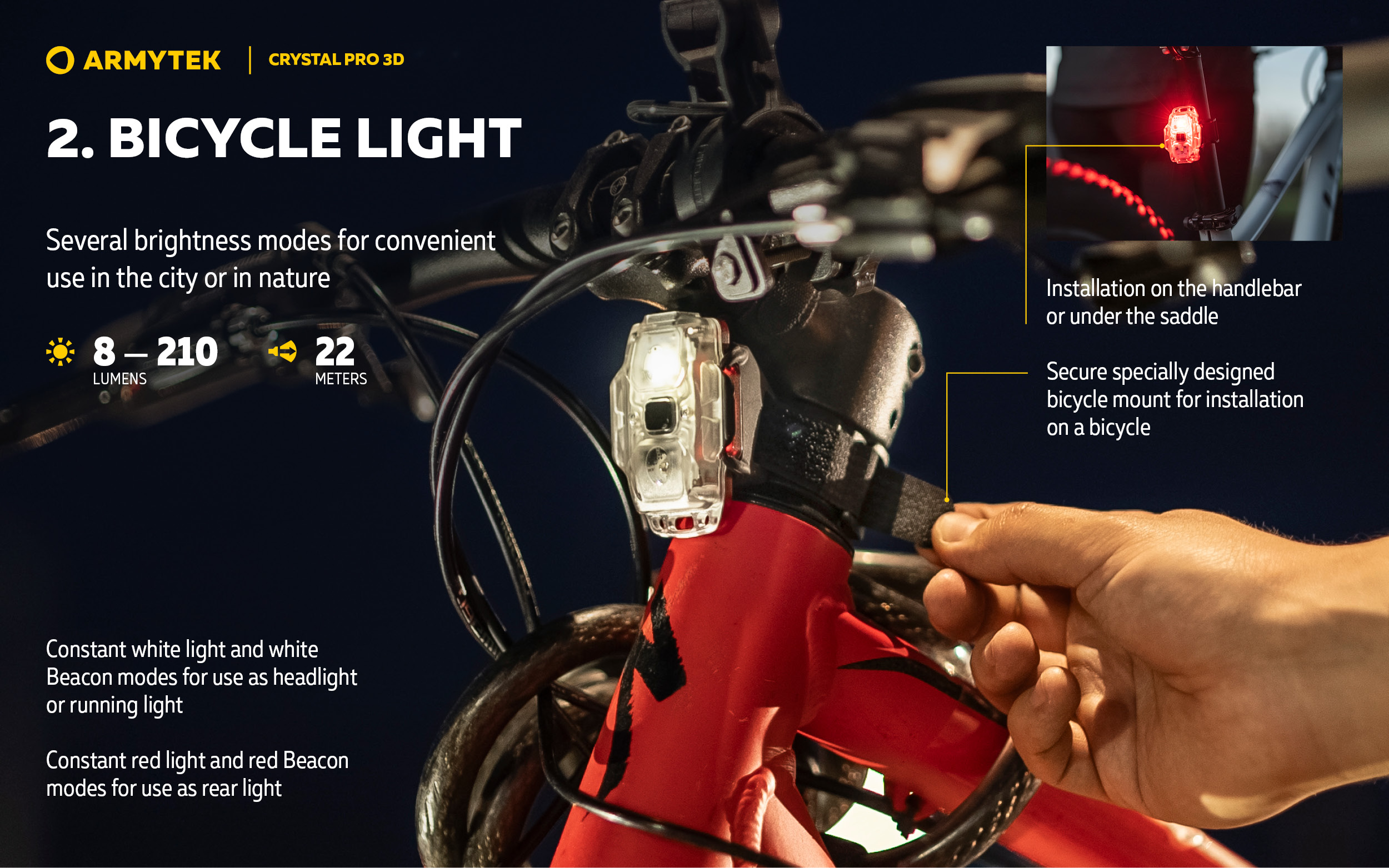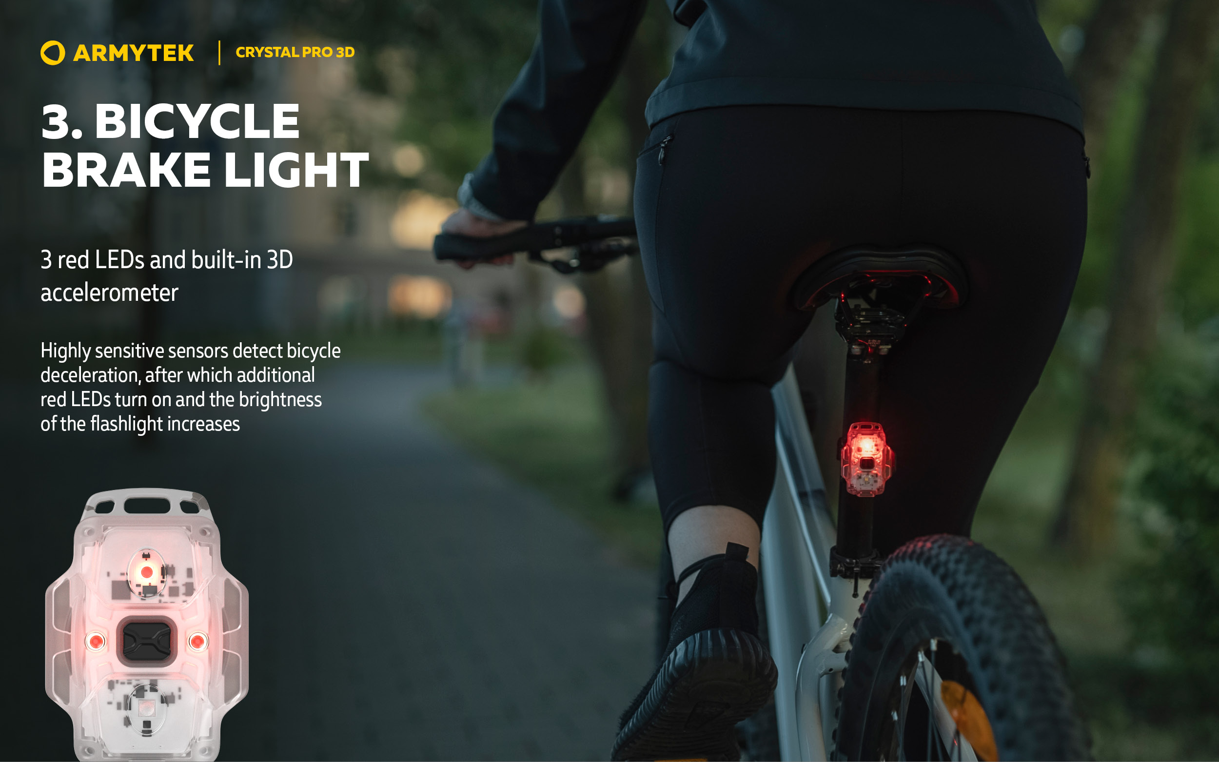 Crystal Pro มาพร้อมเซนเซอร์วัดความเร่งแบบ3D ในตัว สำหรับใช้งานเป็นไฟเบรกจักรยาน และมีขายึดจักรยานที่ให้มาในชุด ช่วยยึดไฟฉายกับจักรยานได้อย่างมั่นคง