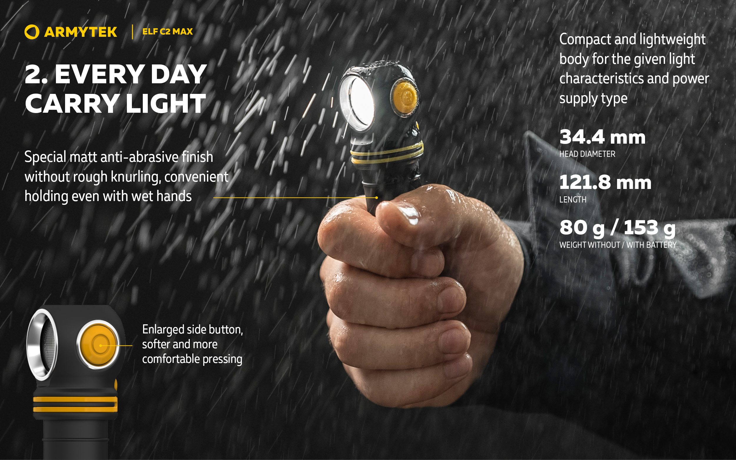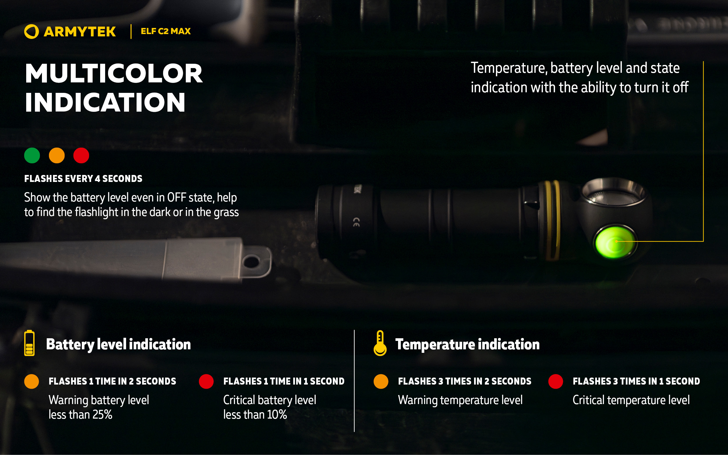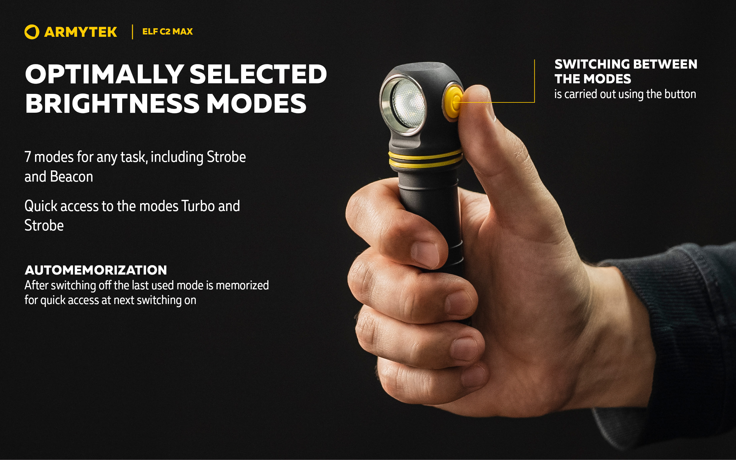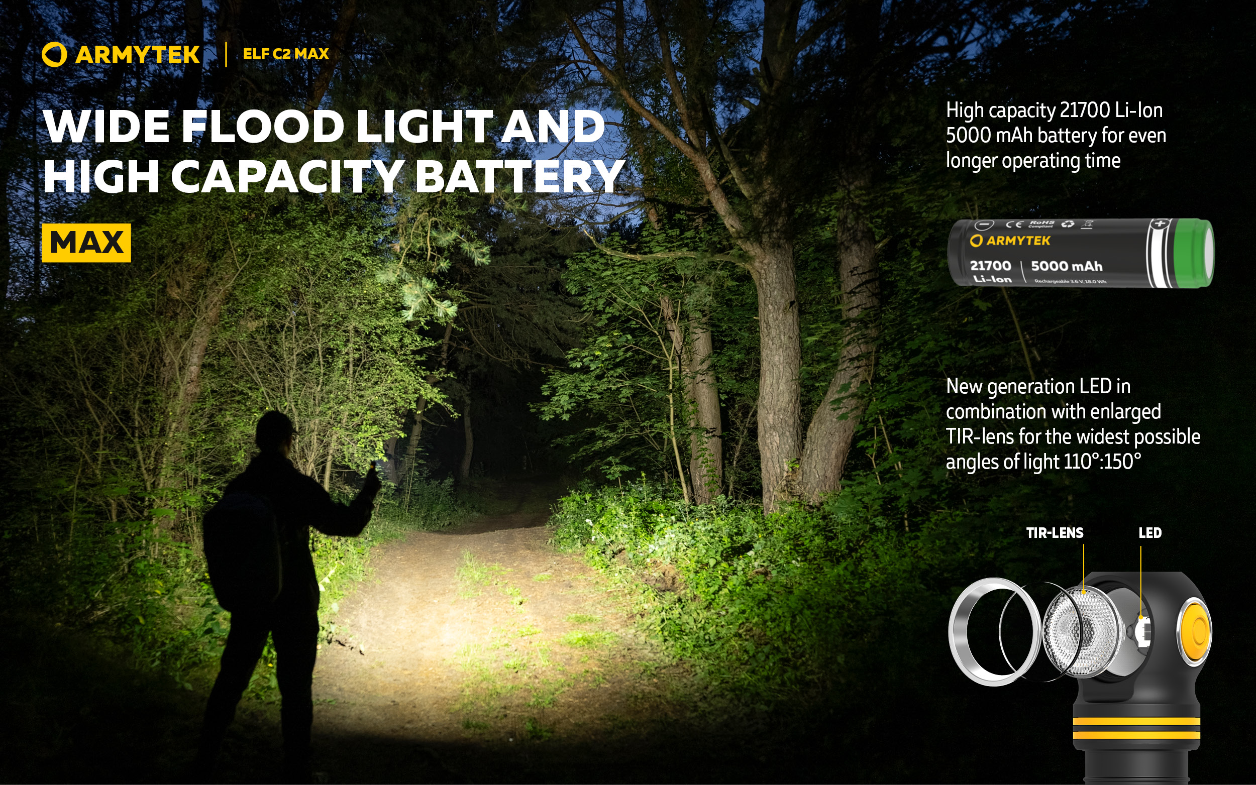 ก้าวสู่ระดับใหม่ของความสว่างในกลุ่มไฟฉายมัลติฟังก์ชัน Elf C2 Max คือผลิตภัณฑ์เรือธงของซีรีส์ มาพร้อมลำแสงกว้าง 110°:150° และความสว่างสูงสุดถึง 4,500 ลูเมน ลำแสงแบบฟลัดไลต์กว้างและโหมดการทำงาน 7 โหมด ทำให้รุ่นนี้เหมาะอย่างยิ่งทั้งสำหรับงานระยะใกล้และการส่องสว่างพื้นที่ขนาดใหญ่ เช่น การตรวจสอบพื้นที่ งานบริการและอุตสาหกรรม กิจกรรมกลางแจ้ง หรือกีฬา