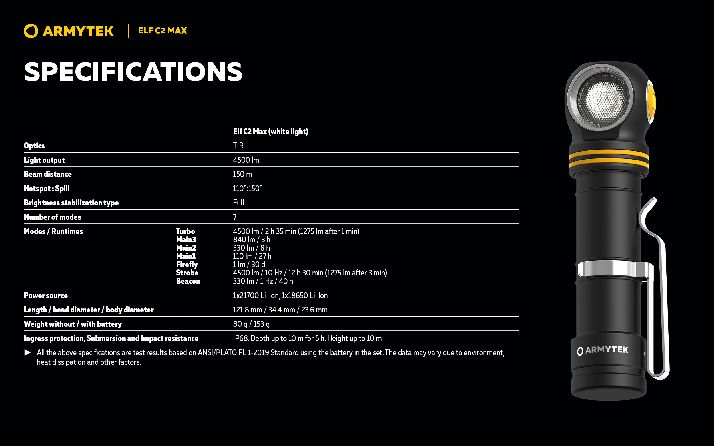 Turbo : 4500lm / 2h 35 min (1275 lm after 1 min)
