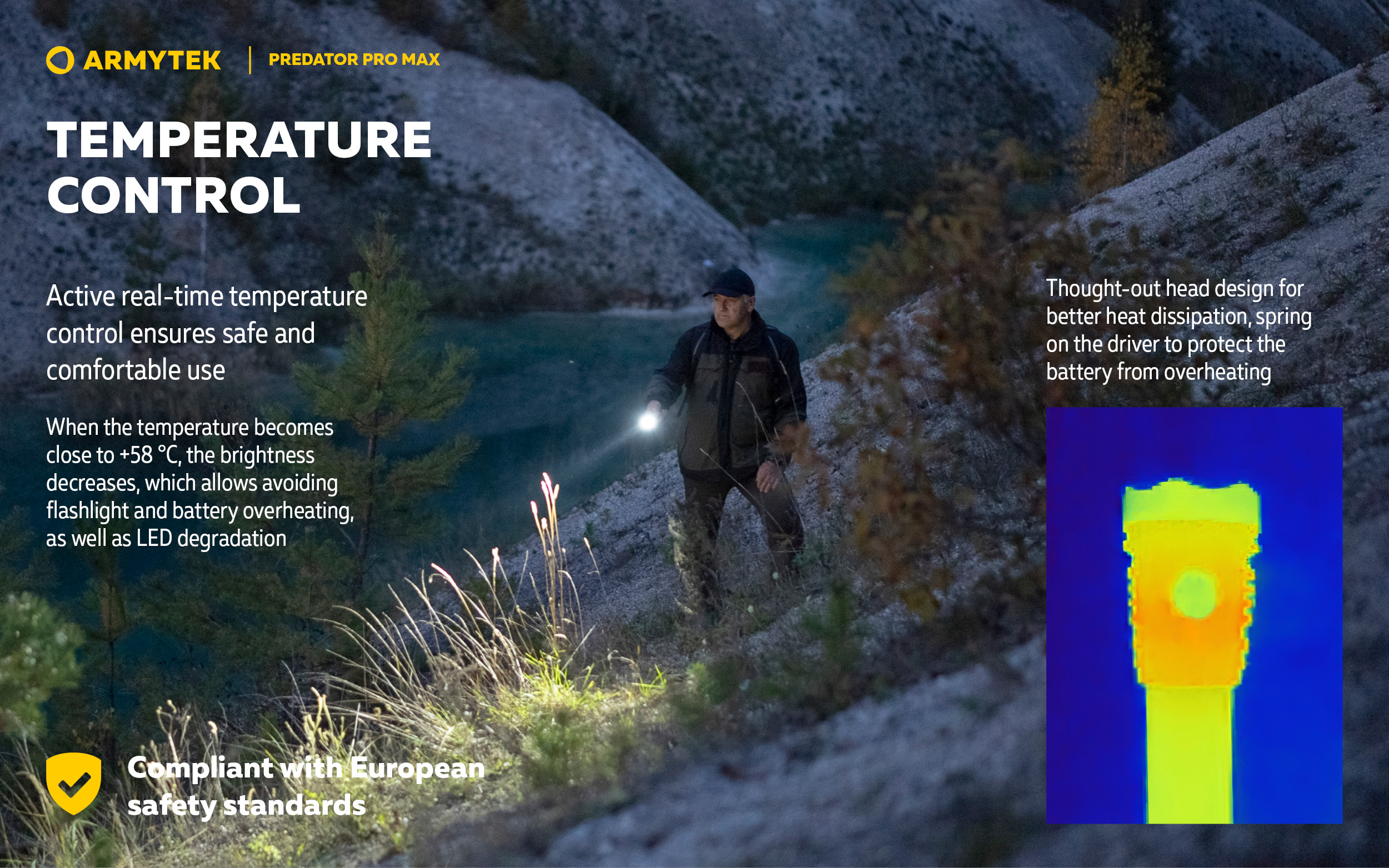 ระบบควบคุมอุณหภูมิอัจฉริยะแบบเรียลไทม์: เพื่อความปลอดภัยและการใช้งานที่สบาย เมื่ออุณหภูมิใกล้ +58°C ความสว่างจะลดลงอัตโนมัติ เพื่อป้องกันไฟฉายและแบตเตอรี่ร้อนเกินไป