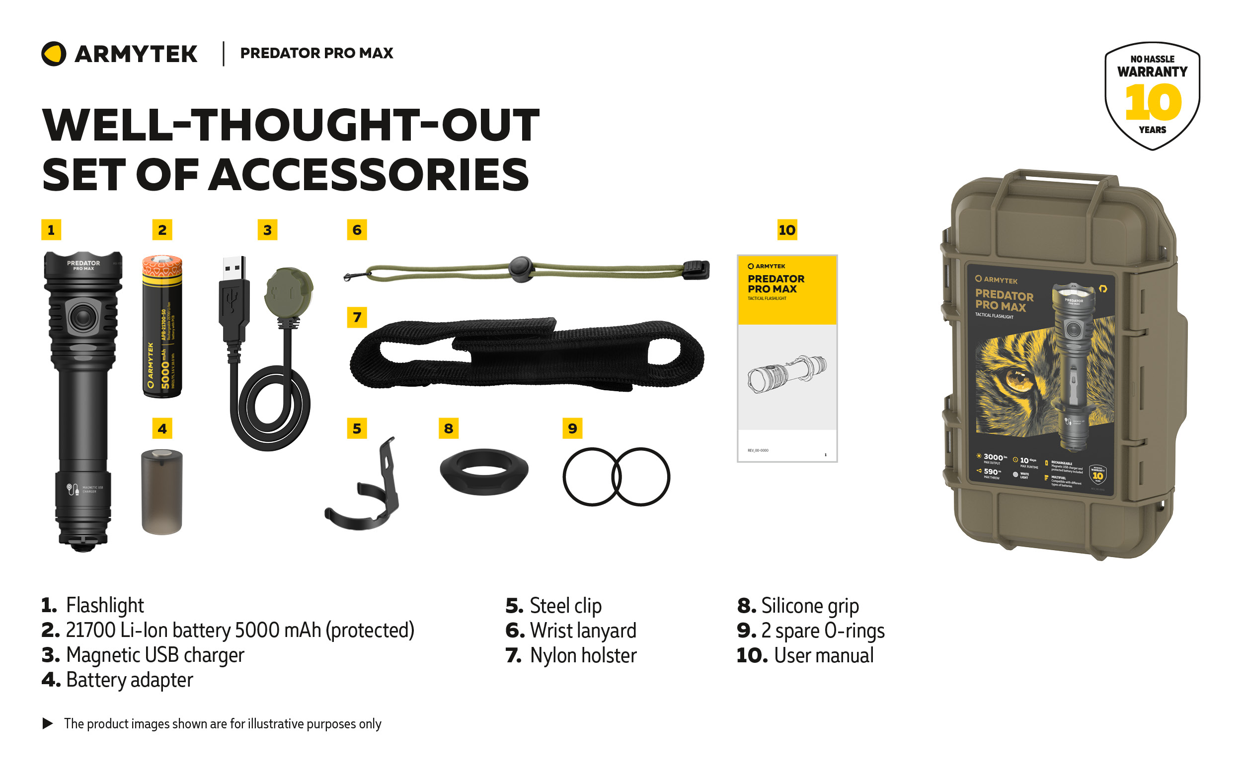 คลิปไฟฉาย, สายคล้องมือ, ซองไนล่อน, แหวนซิลิโคน, โอริงสำรอง, คู่มือ