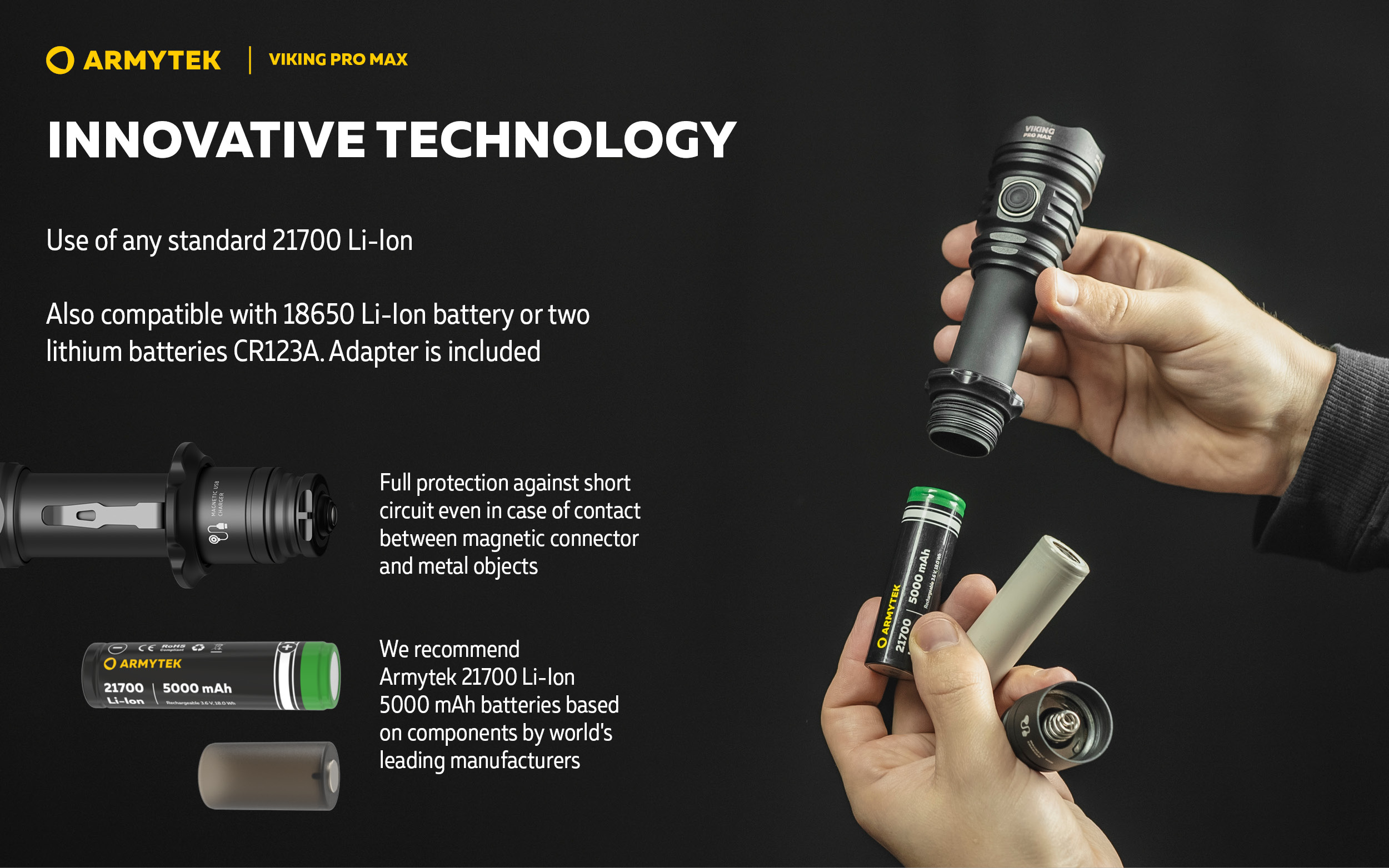 รองรับแบตเตอรี่หลากหลายชนิดและขนาด: ใช้งานได้กับแบตเตอรี่ Li-Ion 21700 หรือ 18650 จำนวน 1 ก้อน รวมถึงแบตเตอรี่ลิเธียม CR123A จำนวน 2 ก้อน