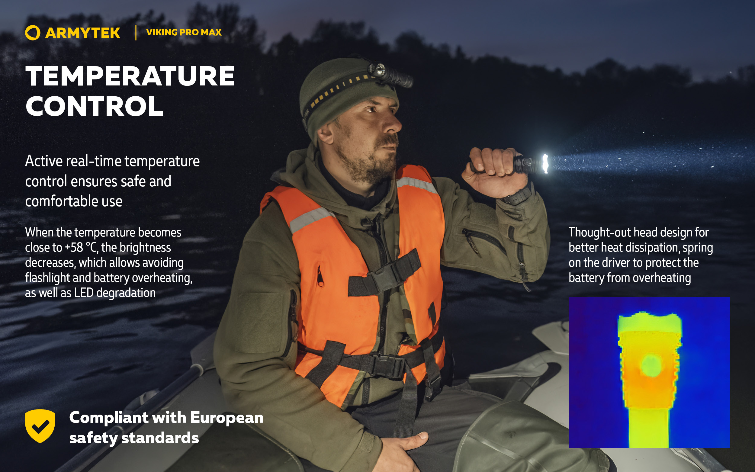 เพื่อป้องกันไฟฉายและแบตเตอรี่ร้อนเกินไป รวมถึงลดการเสื่อมของ LED เป็นไปตามมาตรฐานความปลอดภัยของยุโรป
