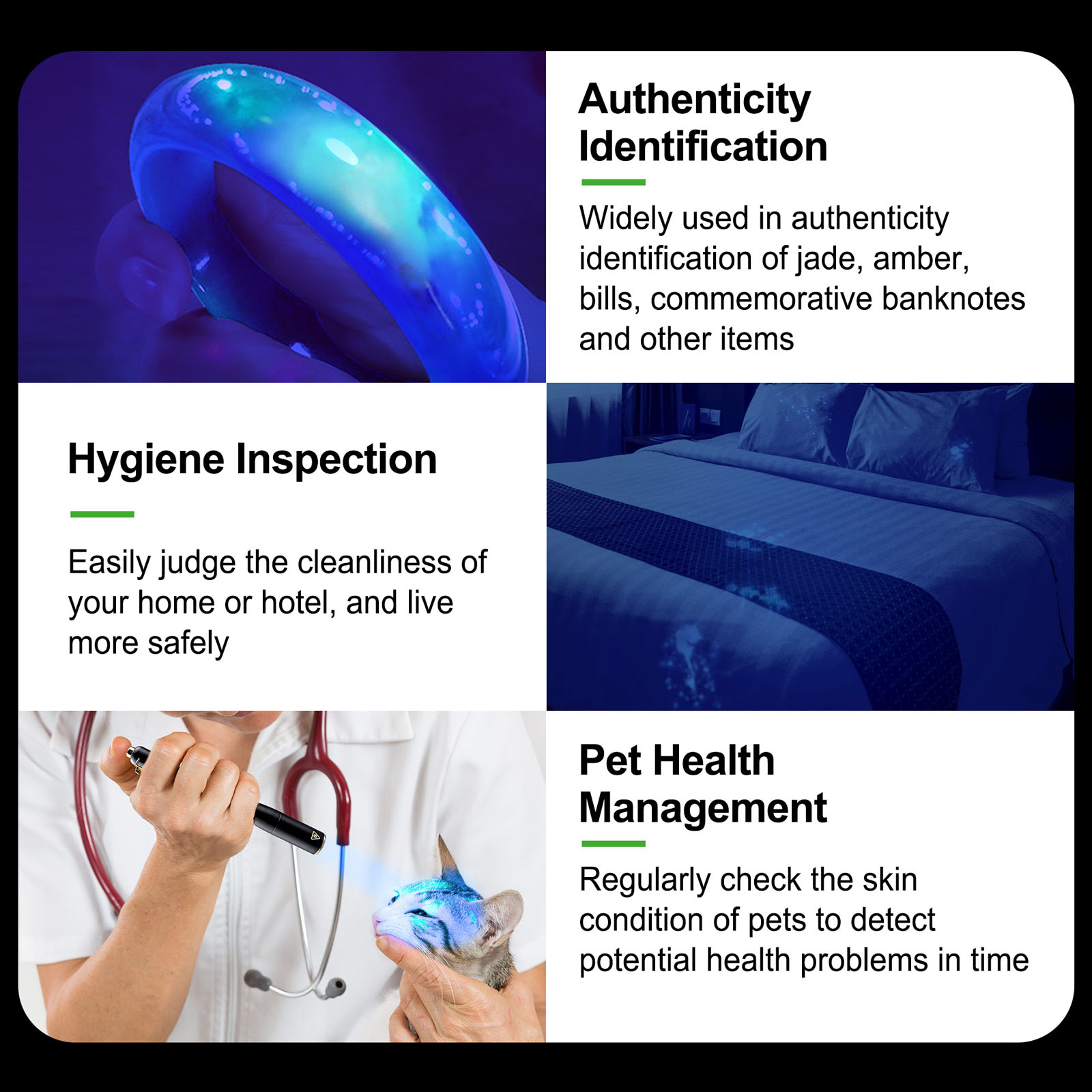 หลักฐานและการตรวจสอบเอกสาร ให้พลังงาน UV ที่ผ่านการกรองแล้วสูงถึง 1,300 mW (มิลลิวัตต์) เทคโนโลยี Fine Woods Glass ช่วยขจัดแสงรบกวน ทำให้มั่นใจได้ถึง