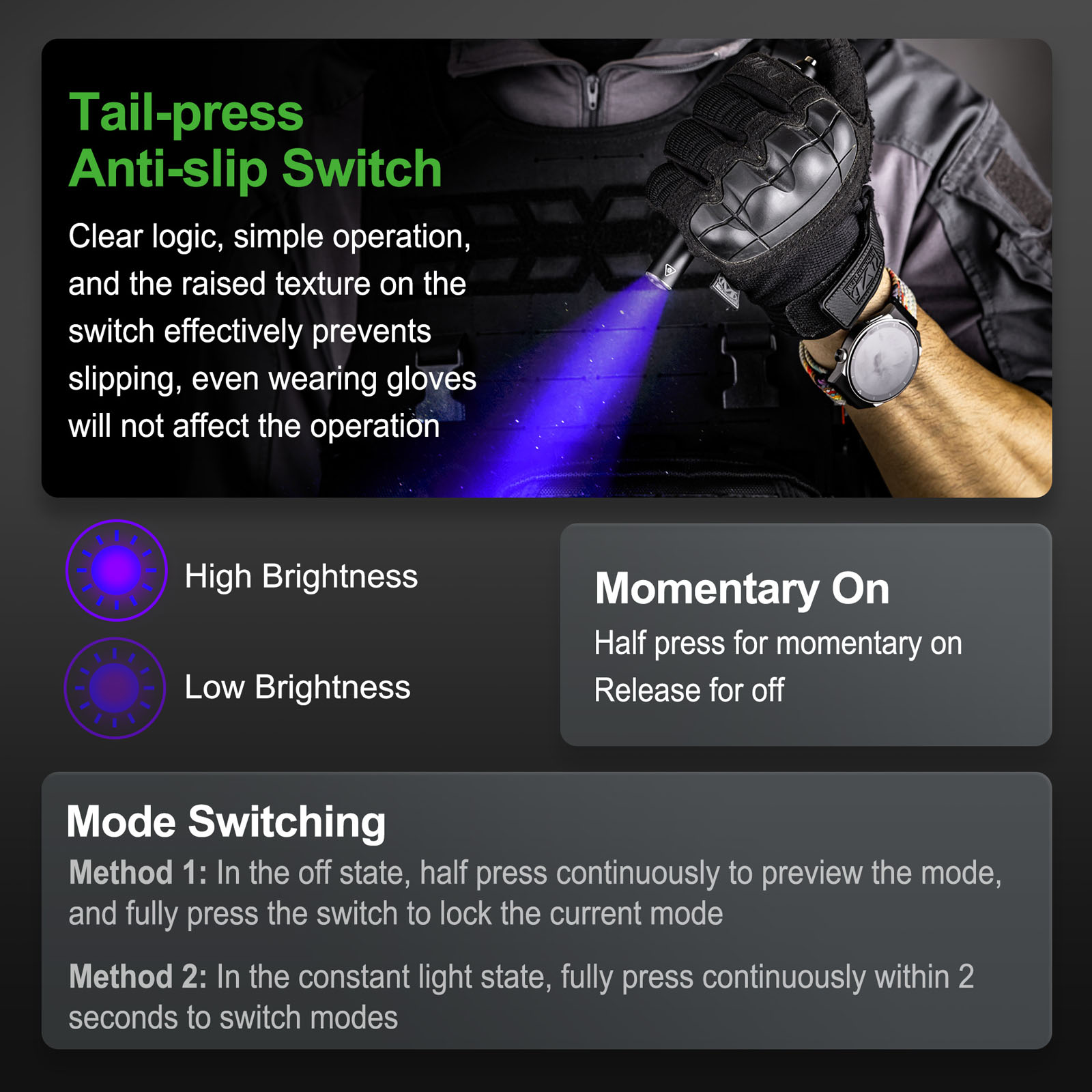 พร้อมสวิตซ์ท้ายแบบเทคติก ที่ช่วยให้สามารถเปิดใช้งานได้ชั่วคราวระหว่างการตรวจสอบ
