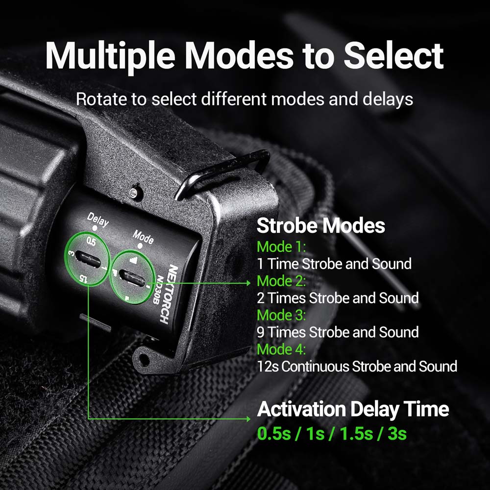 ส่วนโหมดแฟลช 9 ครั้งและโหมดต่อเนื่อง 12 วินาที ช่วยสร้างเอฟเฟกต์ยับยั้งที่ยาวนานสำหรับงานรักษาความปลอดภัยในบ้านหรือการฝึกเฉพาะด้าน