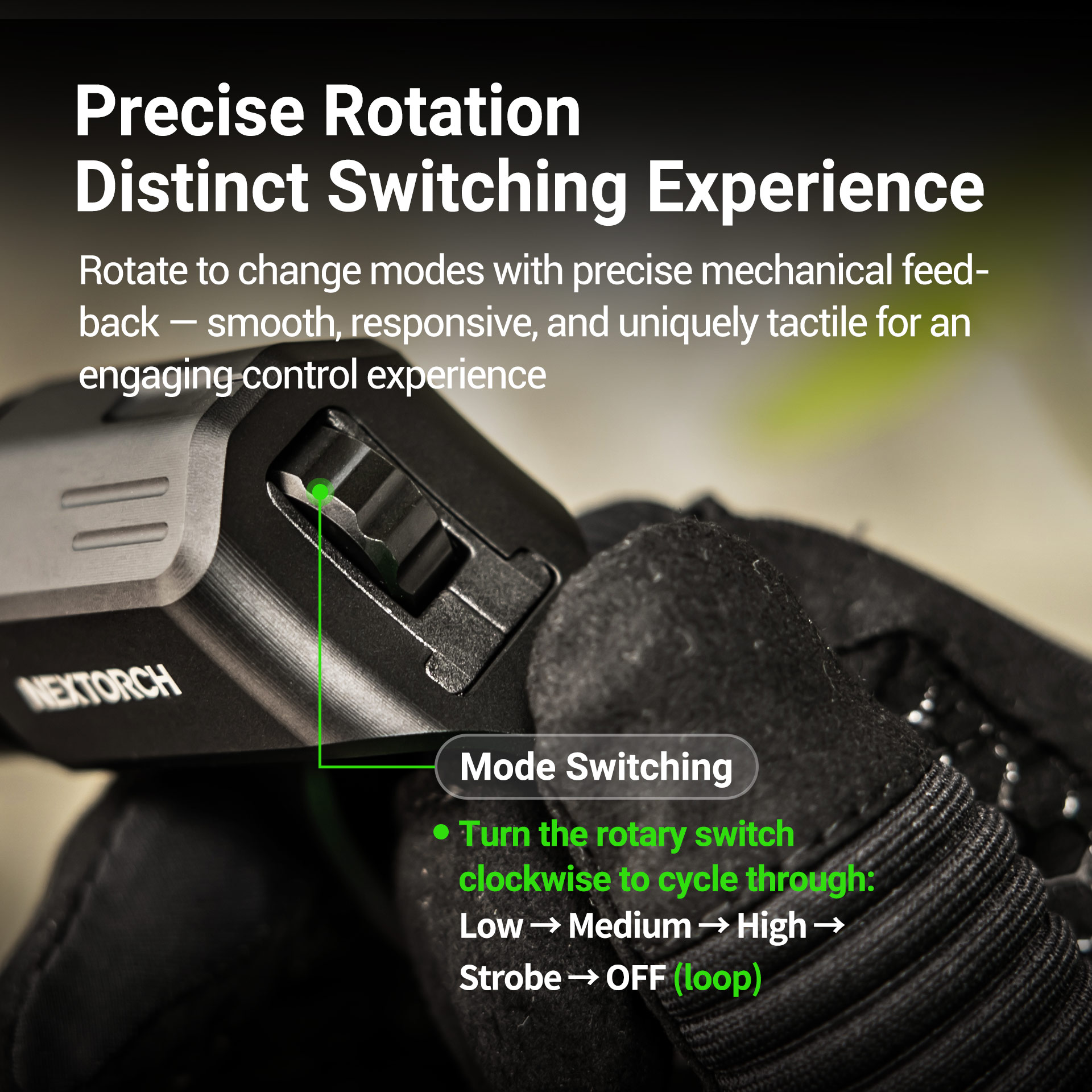 ไฟฉายรุ่นนี้มาพร้อมสวิตช์โรตารี่แบบยุทธวิธีที่ก้านท้าย ให้การควบคุมที่ง่ายและเป็นธรรมชาติ